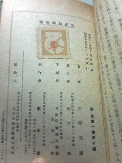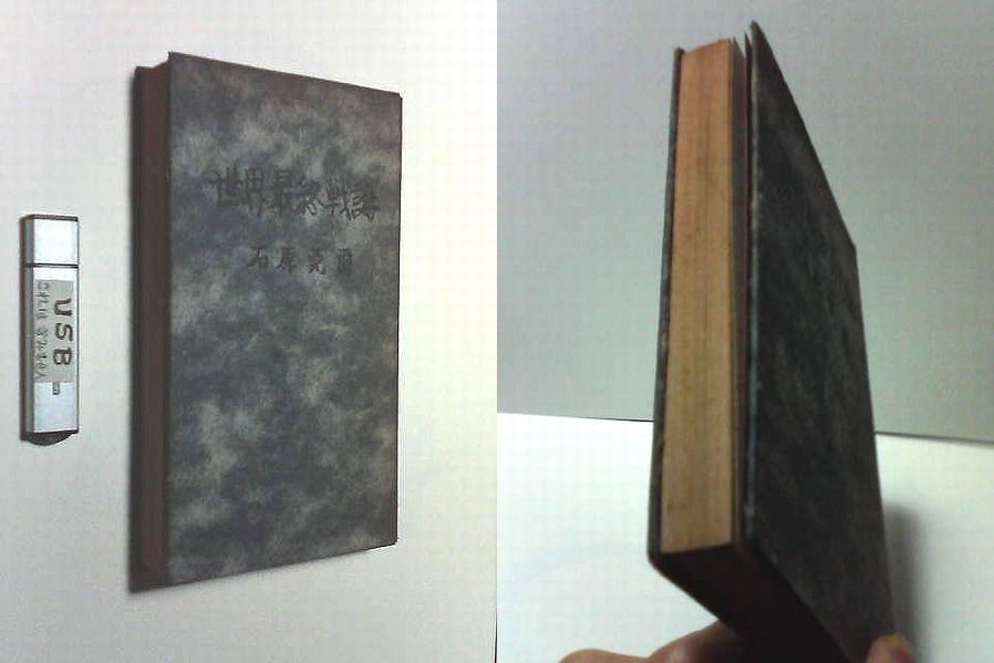 石原莞爾が1940年立命館大学出版部より出版した本を1942年増補改訂して新生堂という出版社より出した本の初版本で、その価値はいまさら説明するまでも有りませんが、1940年版よりこちらの方が価値は高いようです、中が若干ヤケてますが、当時の紙質的に仕方ありません、他はそれ程悪くありませんが、外装が改装されてますので御注意ください (3600円)